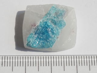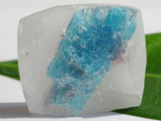柱状結晶の形状は残していますが、欠けが多く、柱面はガタガタしています。 しかし、結晶のどこを見ても、透明感があることが分かります。この質感で形がはっきりしていたら、とても美しい結晶だったのではないかと想像します。 ブルーも明るく、白地に映えます。 母岩は四角に研磨されています。 |