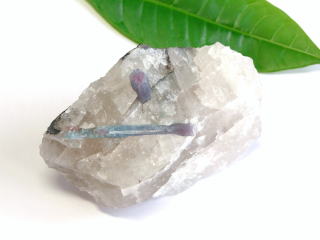 迫力ある二つの柱状結晶。 長い方は、途中欠けもありますが、最長43mmx直径4mmです。ブルーとパープルが絶妙な混ざり具合で、とても美しい結晶です。 短い方は、長さ12mmx直径6mmあります。正面から見ると、濃いパープルですが、結晶の断面を見ると、外側はブルー、内側はパープルのウォーターメロンになっています。 二つの結晶が、直角に成長している原石というのは、あまり見かけた事がありません。こちらは、見た目の面白さ、躍動感も特徴だと思います。 |