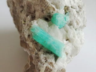 | 透明感はやや欠けますが、黒っぽさが無い明るいグリーン色がしっかりのっています。目立った欠けが無く、表面もつるっとしています。 母岩全体には細かい黄鉄鉱が付き、キラキラとしています。 そして、よく見ると小さなエメラルド結晶たちが顔をのぞかせています。母岩の中にまだ埋まっているものもあるかもしれませんね。 |