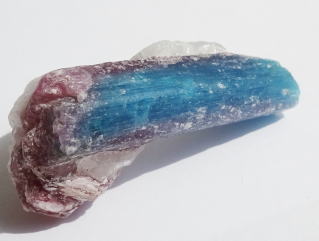 美しいブルーとパープルのコンビネーションです!! 結晶の半分が濃い青で、残り半分が紫がかっています。この色の混ざり合いがなんとも見事な雰囲気を醸し出しています。 結晶の大きさは、長さ40mmx直径10mmと存在感ある堂々とした姿、目立った大きな欠けも無く、柱面がとても綺麗です。 ネオン系とはまた違う趣を持つ原石です。色良し、形良しの格好良い逸品です! |